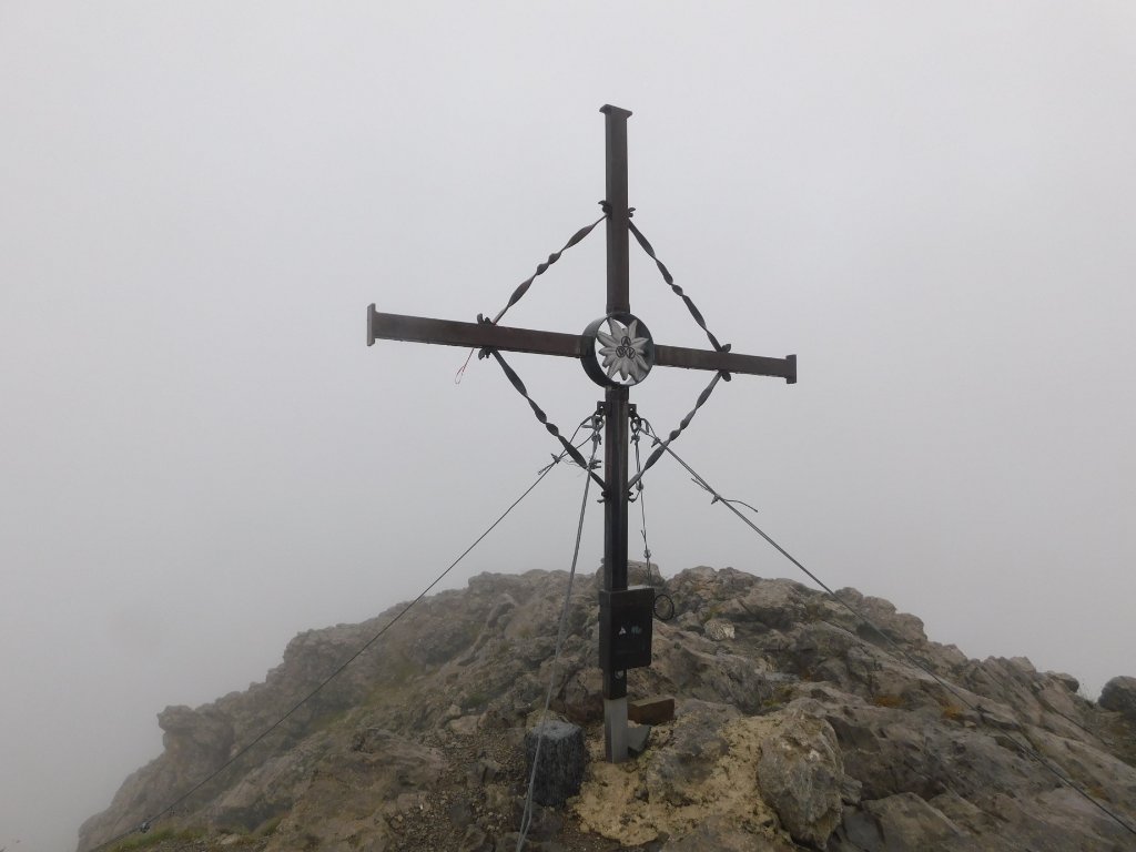 Auf der Steinkarspitze hatten wir dann einen „tollen“ 360-Grad-Rundumblick, der das Kontrastprogramm zu allerhand Schwärmerei vom Aufstieg darstellte: Nebel wohin das Auge auch blickte!