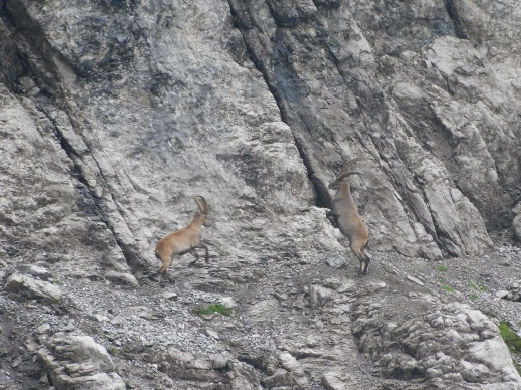 Siehe, da…, es war unglaublich: weiter drüben entdeckten wir zwei kämpfende Steinböcke. Das heftige aneinander Donnern ihrer mächtigen Geweihe halte an den Felswänden wieder. Durch den Kampf lösten sie immer wieder im Geröll kleine Steinschläge aus. Ein Naturschauspiel mit Seltenheitswert, wie sich der eine immer wieder auf die Hinterbeine stellte, um dann rasant mit seinem Geweih auf den Gegner herunter zu knallen. Ein überraschender Anblick, sowas hatten wir alle noch nie erlebt. Alexs seiner Kamera mit gutem Zoom sei Dank, sodass wir das Ganze auch noch fotografisch festhalten konnten.