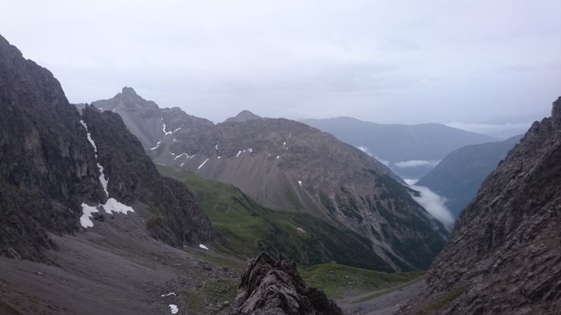 Die Wetterlage war nicht optimal, sodass wir schnell einen Plan B erarbeiten hatten. Dementsprechend kam es, dass wir drei am Samstag früh bereits um 6 Uhr an der Hütte durchstarteten. Vielleicht könnten wir noch vor dem großen Gewitter, das gegen 11 Uhr angesagt war, die Parzinntürme angehen?