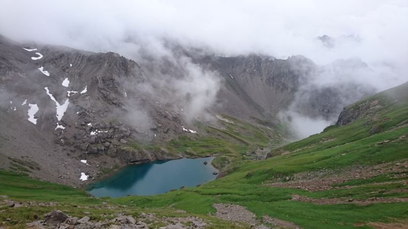 Am Joch angekommen ging‘s unschwierig auf den Gipfel. Oben herrschte eisigstes Wetter und das im Juli! Sodass wir mit Wintermütze, Daunenjacke, Handschuhe und selbstverständlich passend kombiniert mit kurzer Hose *brrr* eine Gipfelrast versuchten. Lange ging das nicht, denn es war so kalt, dass wir alle schnell entschieden wieder absteigen zu wollen. Zurück am Joch entdeckten wir doch tatsächlich drei Menschen unten am wunderschönen Gufelsee. Da, es schwamm sogar jemand darin. Verrückt, wirklich, einfach nur verrückt, bei dieser Kälte.
