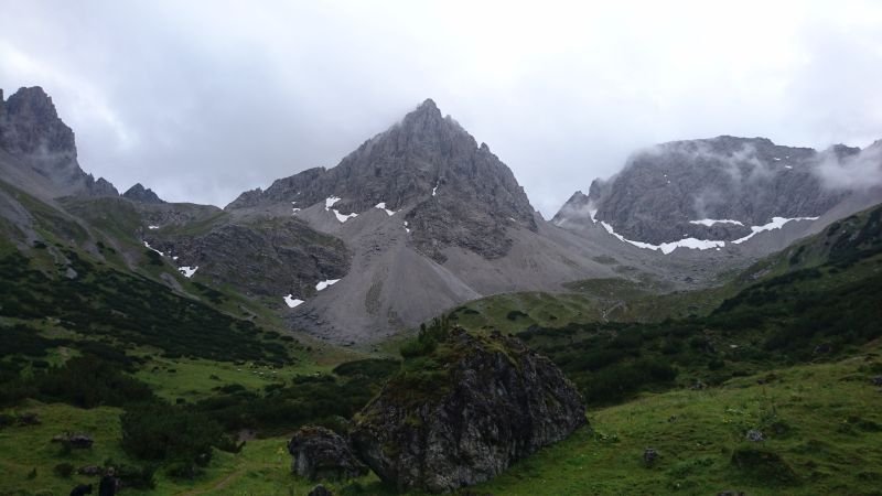 Nebel schränkte die Sicht hier leider deutlich ein, immer wieder riss kurz eine Nebelbank auf. Sie gab uns den Blick auf die rassigen Parzinntürme frei und in der Ferne tauchte die Kogelseespitze auf. Schnell war klar, bei solch einem Wetter ist wegloses Gelände mit ungesicherten Kletterstellen keine gute Wahl. Also entschieden wir zunächst zum Gufeljoch abzusteigen, um dann die Kogelseespitze erklimmen zu können.
