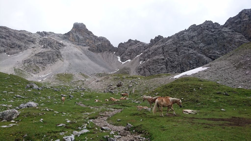 Nun, endlich, der Regen hatte bereits länger aufgehört gehabt und der Fels war zügig getrocknet. Eine tolle einsame Tour, bei diesem Wetter, im Aufstieg grüßten wir wieder den bekannten Steinbock vom Vortag und die Pferdeherde war nun auch herüber gekommen. Es bot sich hier wirklich schon fast eine Bilderbuchkulisse, mit blühenden Alpenrosen und allerhand anderer bunten Alpenblumen wie Teufelskrallen, Kohlröschen und Co. Gepaart mit den blonden Pferden und der atemberaubende Bergkulisse um uns herum - einzig die Sonne fehlte etwas.