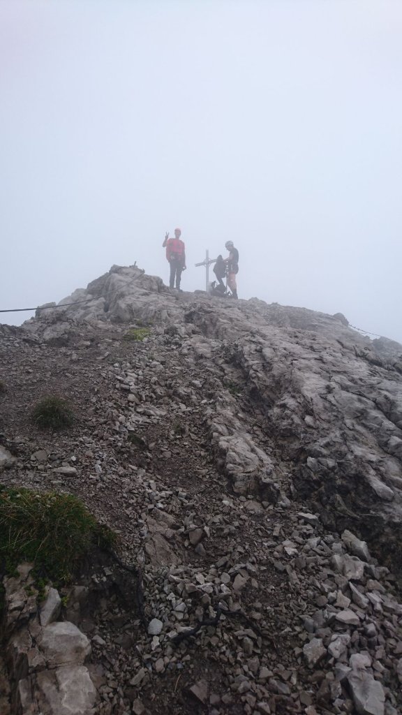 Auf der Steinkarspitze hatten wir dann einen „tollen“ 360-Grad-Rundumblick, der das Kontrastprogramm zu allerhand Schwärmerei vom Aufstieg darstellte: Nebel wohin das Auge auch blickte!