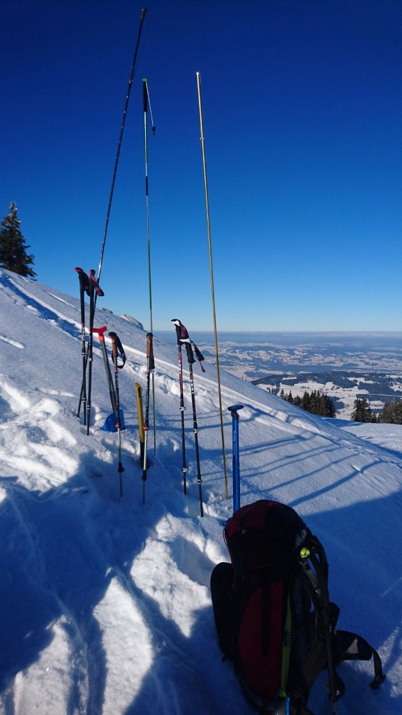 Als wir die Grüntenhütte erreicht hatten, suchten wir etwas oberhalb einen schönen Platz für unsere Übungen mit der Lawinenausrüstung. An einem Südhang mit etwas Schnee fuhren wir die Lawinensonden aus, ein Klicken und die Schaufeln waren auch bereit zum Graben. Nun noch den An-Knopf der Geräte gedrückt und es konnte auch gleich schon losgehen.