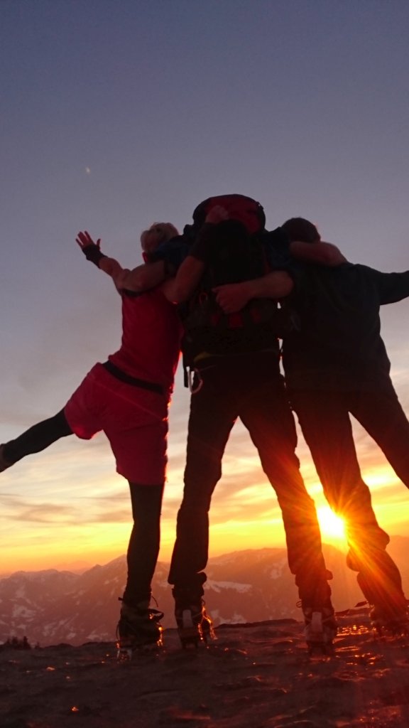 Alle freuten sich schon auf die oft angepriesenen, sensationellen Seelen auf der Hütte. Also ging es in der Abenddämmerung auf dem Gratstück, sowie dem steilen Stück mit Steigeisen langsam aber sicher Richtung Warmes.